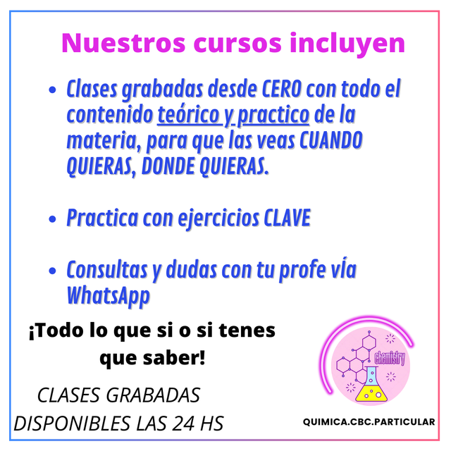 Incluye todos los contenidos teórico/prácticos que tenes que saber para aprobar química de UBA XXI (Catedra única) . Con consultas vía Whatsapp con tu profe para resolver dudas